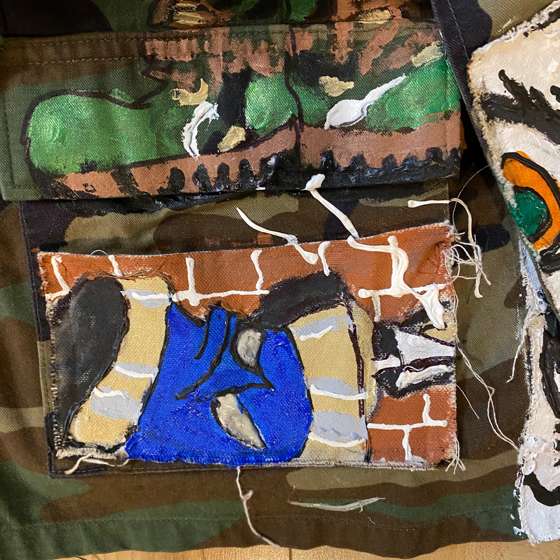 This is a camo vintage jacket purchased in Seattle, Wa. The jacket has 3 extra pockets added to the jacket. There are two front pockets and a large pocket reinforced canvas material for extra storage on the back. The pockets are sewn on and painted on.